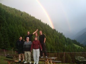 Laura, Mathias, Maxime, Roli, Yves, Cindy, Cosette, Jean-Pierre et Manu étaient aux Moyes ce samedi pour préparer le camp. Nous avons juste eu le temps de terminer le travail avant le déluge. Quelques bouteilles plus tard revenait le soleil et un superbe arc-en-ciel-double-en-direction-de-Zinal. Les Moyes sont prêtes à accueillir une horde de nains assoiffés de nature et de montagne. Merci à toute l’équipe!
