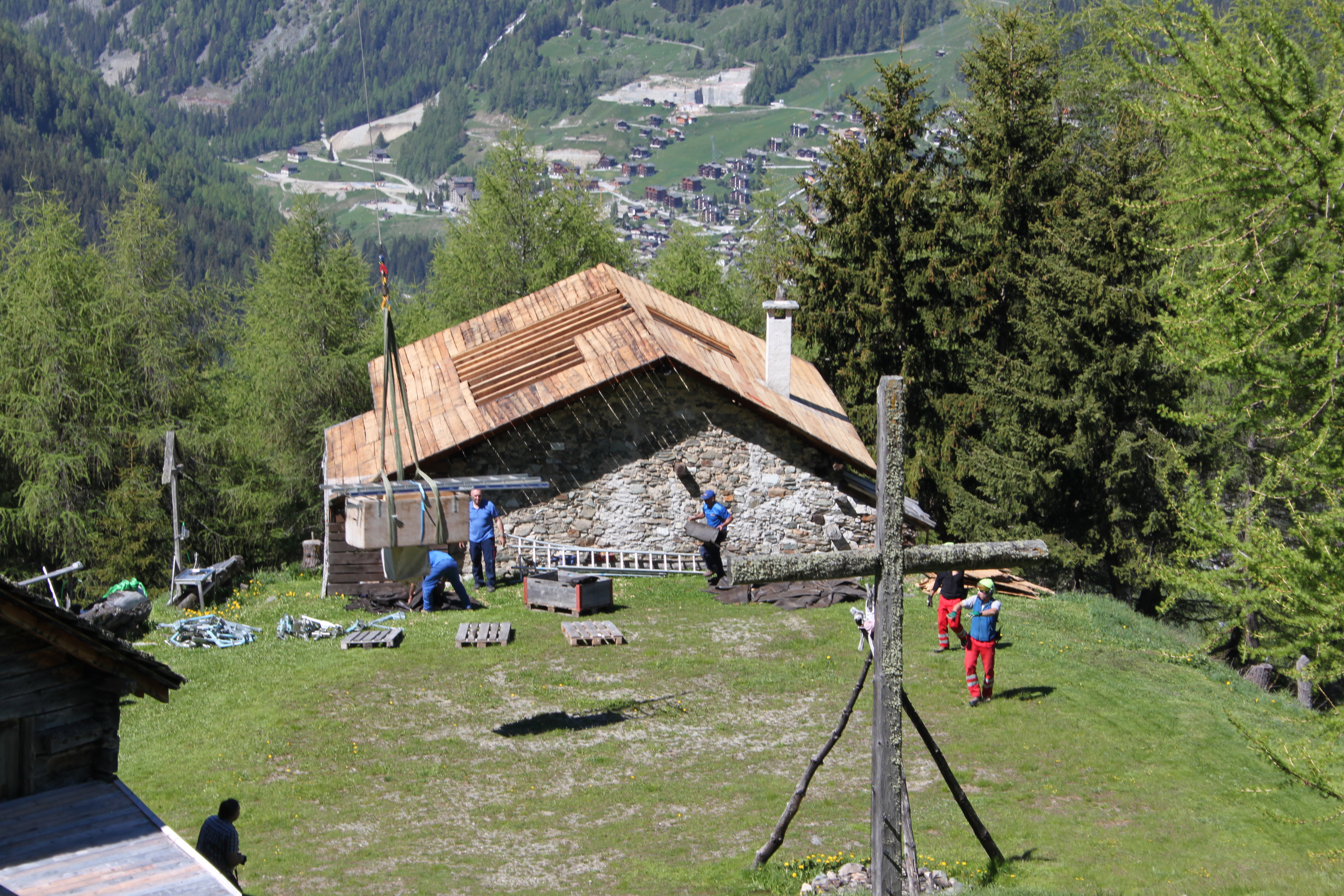 Ce matin, le nouveau toit est arrivé aux Moyes par la voie des airs, il sera construit la semaine prochaine. Alors que le projet initial prévoyait de remplacer les tôles arrachées par la tempête d’avril 2012, ce sont de belles planches de mélèze qui nous abriteront pour le prochain siècle. Merci à la commune, aux artisans, à Air-Glaciers, aux lutins des Moyes.