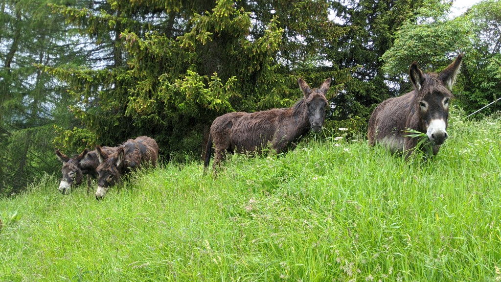 Les ânes sont arrivés aux Moyes, il défrichent le parc du bas, nous retrouverons plus facilement les ballons. Aristote a le museau noir, Cassis au premier plan passe ses étés au mayen depuis quatre ans, Luna est la seule dame, Quentin se reconnaît aux taches noires sur ses épaules. Ils aiment les pommes, les carottes et les câlins. Ils aiment aussi le pain, mais c’est pas bon pour eux selon Paulette de la Ferme à Cadichon.