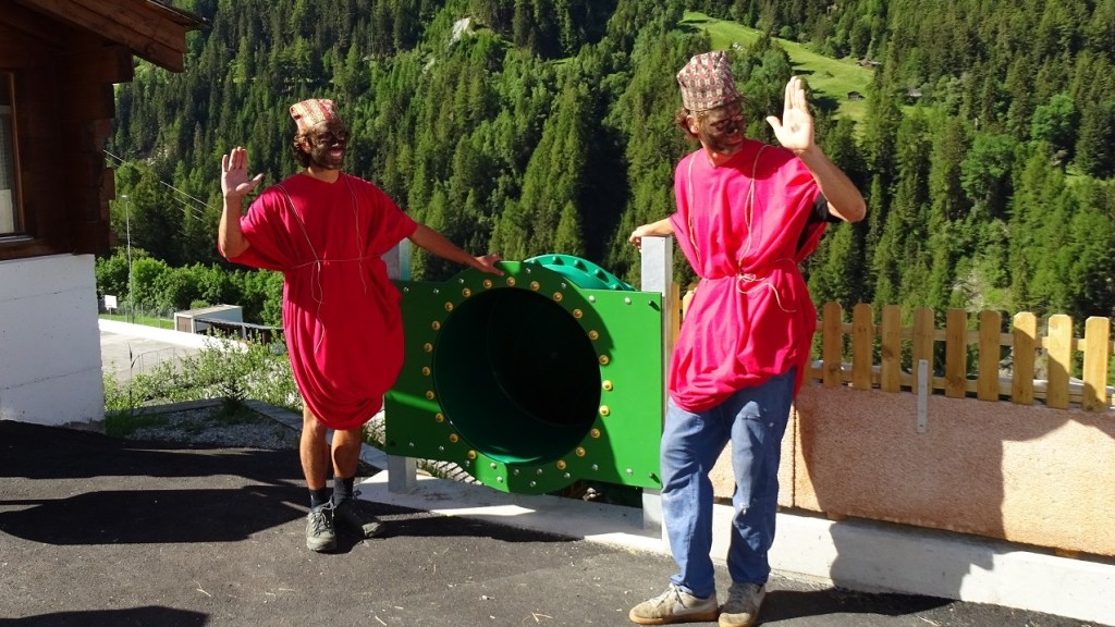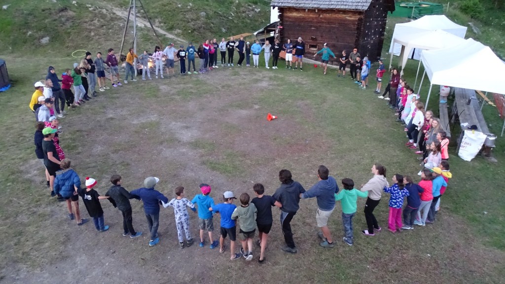 Nous avons pique-niqué en chemin pour arriver aux Moyes vers 14h, histoire de nous installer au camp, de former 7 royaumes qui s’affronteront en d’incroyables et aventureuses joutes jusqu’en fin de semaine. Visite du capitaine des pompiers pour superviser nos exercices de sécurité puis nous avons profité de l’excellent ragoût préparé par le restaurant des Bouquetins à Zinal, favorisez nos sponsors ! Après le coucher du soleil et des jeux de groupes débordants d’enthousiasme, les jeunes ont entendu les plus horribles histoires de revenants d’Anniviers et des 7 terres.