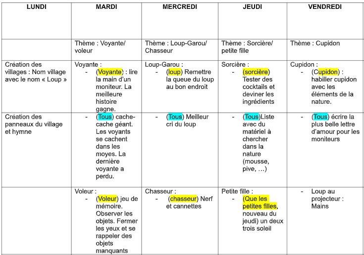6. Le thème est facile les idées fusent, chaque village choisira un nom dans lequel le mot Lou doit figurer. Les rôles seront également choisis par les villageois qui devront les cacher aux autres groupes. La salle du mayen sera sacrée pendant les parties de Loups Garous, les parties seront gérées par des moniteurs. Andy établit une ligne directrice pour la semaine résumée dans le charmant tableau ci-dessous :