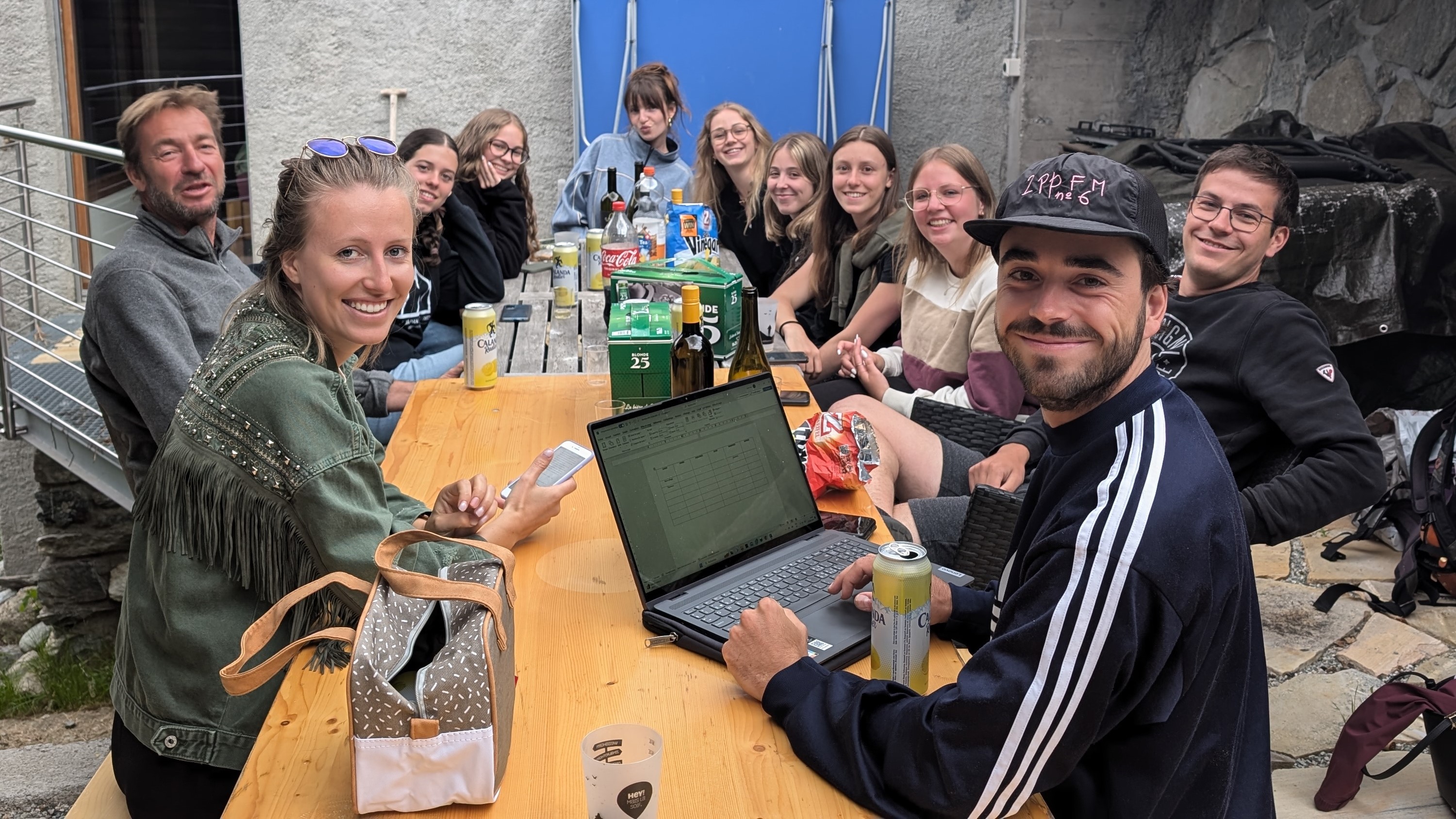 Se retrouvent place de la Soif à Ayer le mardi 25 juin à 18h30 pour préparer le camp des enfants : Soraya, Ludivine, Lynn, Lydie, Romy, Elly, Nalame, Chloé M, Andy, Sven, Corentin et Manu. Andy décrète la fin de toute soif en ce bas monde et le début de notre réunion à 18h47.
