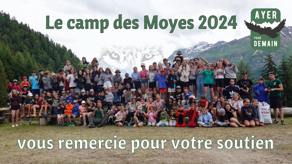 Ayer pour demain, les moniteurs et les participants du camp des Moyes 2024 remercient tous ceux qui nous ont permis de vivre cette magnifique semaine dans la montagne : la commune d’Anniviers, Patrice pour le contrôle de l’eau, Claude pour le feu, Jean-Yves pour les bagages; ceux qui nous ont offert un repas, La Tzoucdana et le supermarché du forum à Zinal, Le Qi-Lin à Ayer, Le Cholaïc à Mission, le Foyer à Sierre pour les confiture; la multitude de coups de mains qui facilitent notre organisation, la société du village de Zinal pour les tentes, Taxi Michel pour les petits du jeudi, la doctoresse Franziska, Yves pour la brouette, Paulette pour les ânes, Soraya, Lynn, Corentin, Norman et Sven pour l’intendance et les transports, les parents qui nous renouvellent chaque années leur confiance, le Bon Dieu pour la météo et l’absence de bobos.