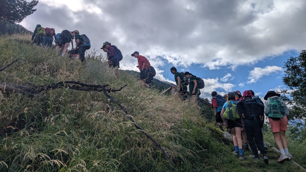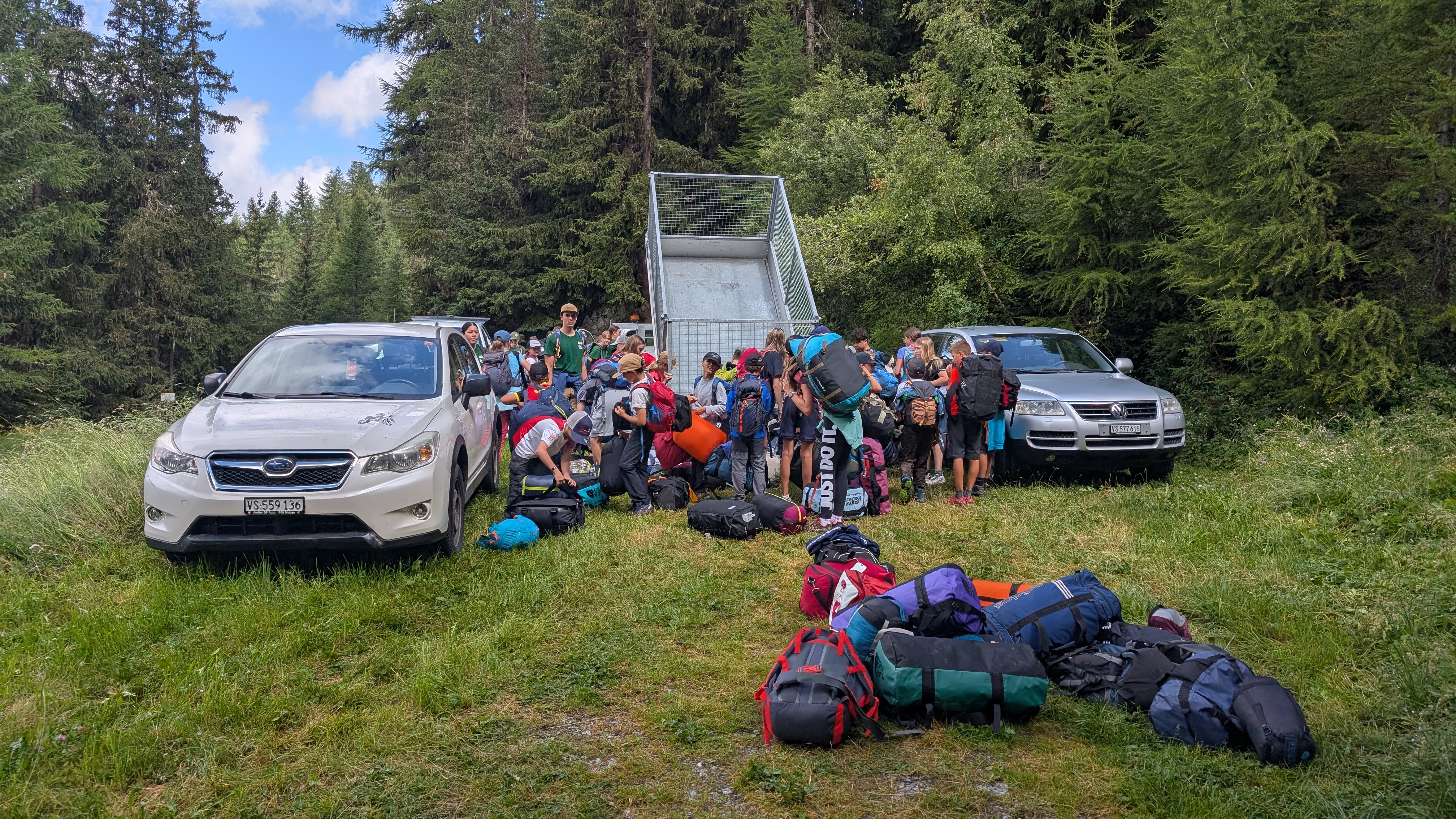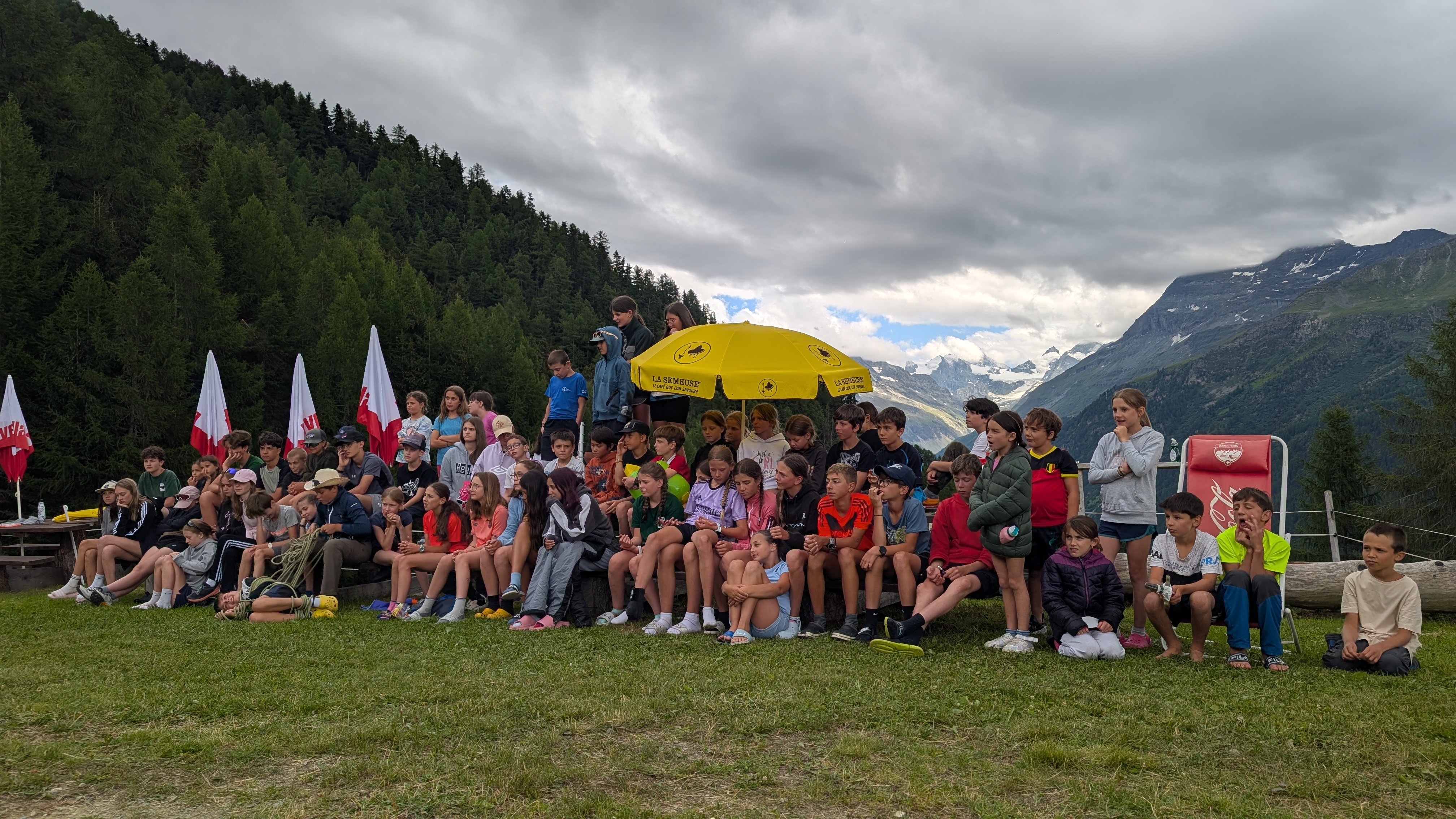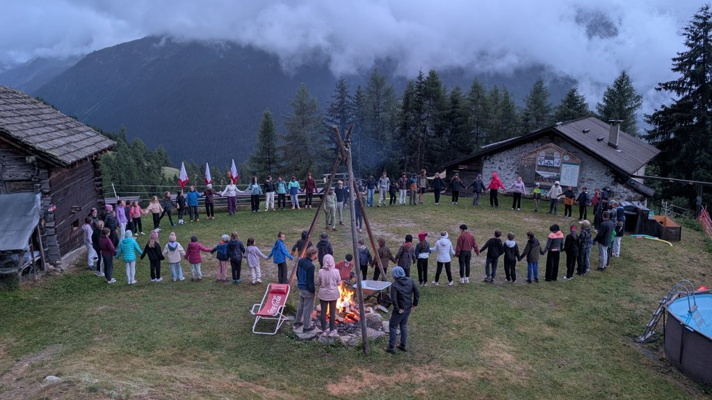 On a profité du soleil jusqu’en fin de journée, la première averse est arrivée pendant le cours de Bastian. Respecter les règles autour du feu, situer ses affaires et sa lampe de nuit, se retrouver sur la place centrale en cas d’alarme, rester secs même quand il se met à pleuvoir. La sauce bolognaise offerte par la Tzoucdana, amenée par Coco et Chloé, nous a donné l’énergie pour une série de jeux, mais c’est la maison blanche, notre « Zürich Paradeplatz » qui accueille toute l’équipe pour les contes et légendes.