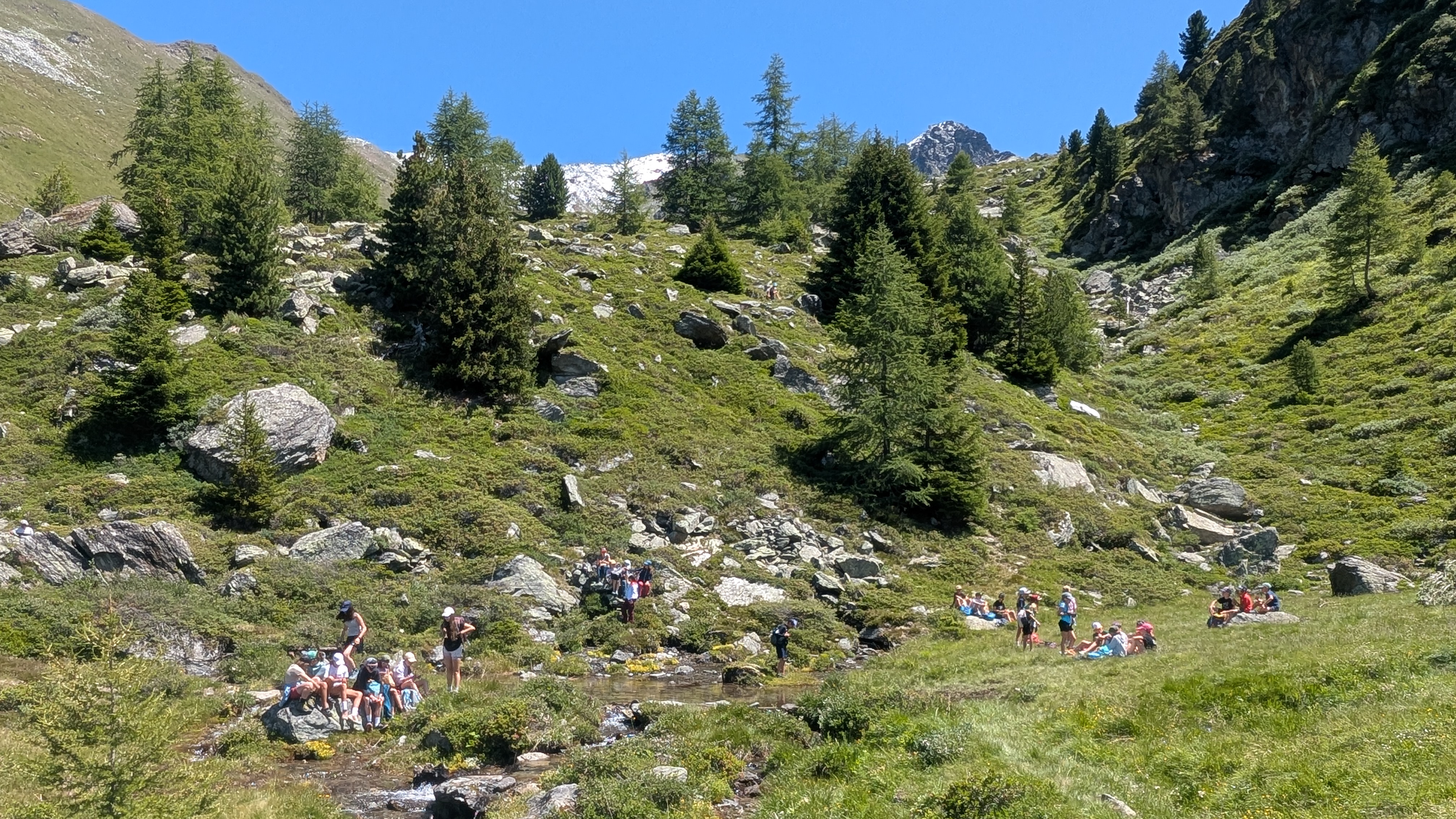 Au programme du jour randonnée jusqu’au lac des marmottes à Barneusa, direction la couronne impériale, un moment tranquille pour les moniteurs. Le lieu est idéal, une pelouse alpine à peu près plate, de nombreux blocs accueillants, une source extraordinairement fraîche qui crée un petit lac. De quoi s’amuser ou se poser selon l’humeur du moment ou les ordres des moniteurs.