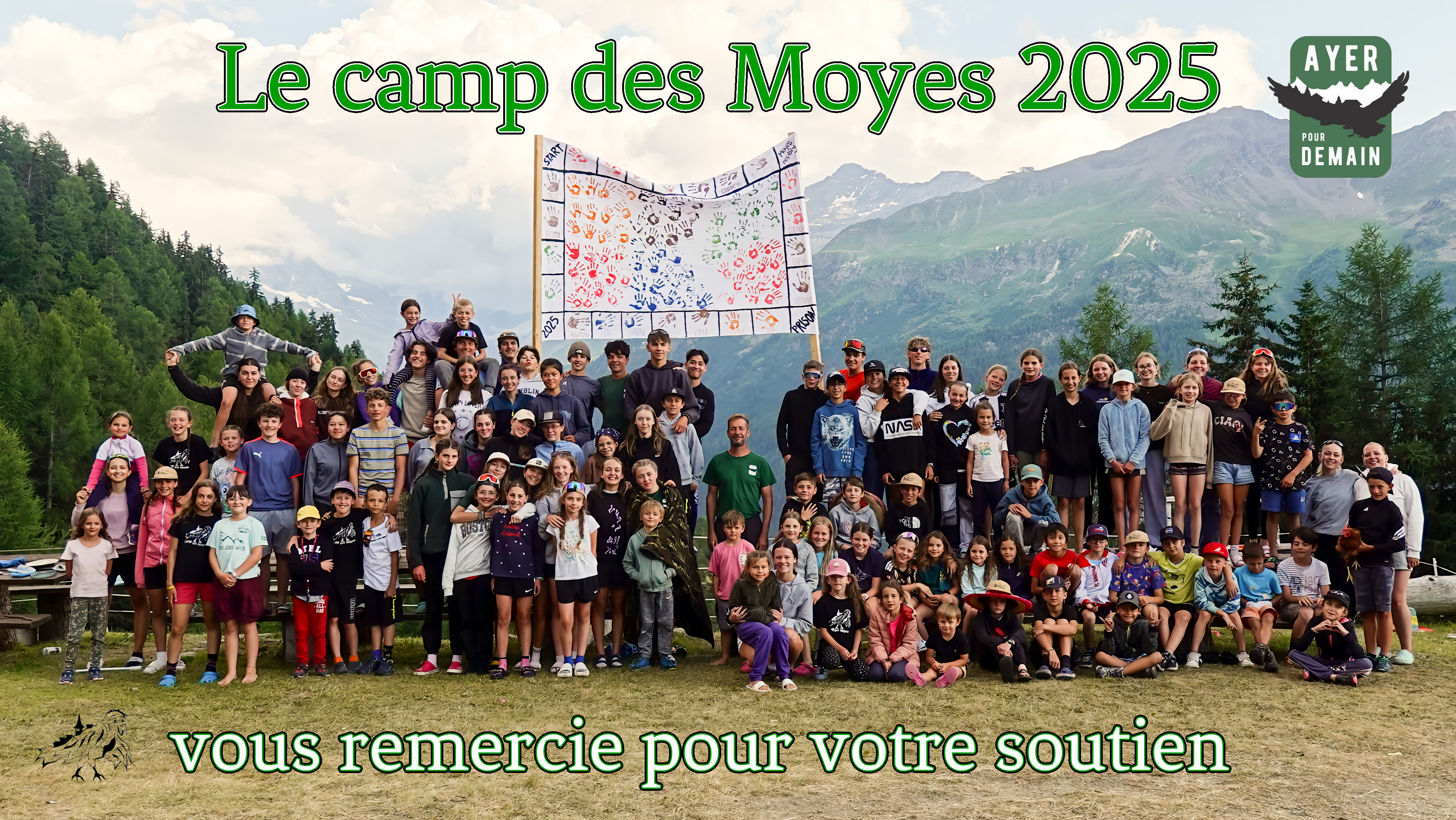 Le comité d’Ayer pour demain remercie tous participants, en particulier les 20 moniteurs bénévoles qui ont accompli un travail extraordinaire dans la meilleure humeur avec une bonne volonté exemplaire. Un merci spécial aux sponsors qui ont préparé nos repas, le relais de la Tzoucdana, l’hôtel Europe, et le supermarché Bonnard à Zinal, le Qi-Lin à Ayer, le Foyer à Sous-Géronde. Bisous aux porteurs de repas Corentin, Chloé, Maurane, Noah, Soraya, Baptiste, Fredéric et Lucas et aux coups de mains pendant la semaine par Laetitia, Katia et Gisèle. Merci à Maurice et Yves pour la brouette à moteur, au triage d’Anniviers, à Multibois pour le dépannage de la génératrice, à Raphy SA pour la camionette. Un grand merci évidemment à la commune d’Anniviers qui nous prête le mayen, monte les bagages, contrôle la qualité de l’eau et les mesures de sécurité, révise les extincteurs tous les trois ans, et à Bastian le pompier pour le cours de sécurité incendie-évacuation du lundi soir. Câlins à Jean-Yves, Patrice, Claude. Ce fut une édition extraordinaire, à bientôt !